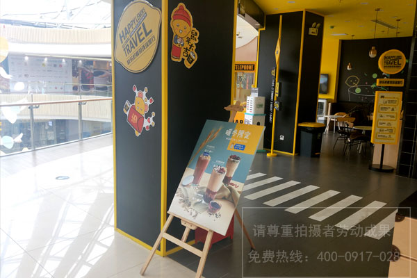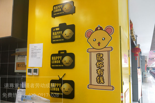 并且門頭不合適做的太花、太亂,用一個主色彩把本人的品牌嵌入進去即可,如快樂檸檬奶茶店主色調采用的就是檸檬黃,如今的群眾審美傾向簡約化。門頭還有告知消費者的作用,要讓人看到的第一眼就曉得這是一家飲品店,所以在設計時最好有飲品的元素。