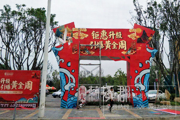 采用鋼管架將整個拱門的骨架搭建完成,然后采用木工板在鋼管架外圍勾勒出需要制作的造型形態。最后將噴繪好的噴繪畫面、KT板噴繪畫面、車貼、發光字等各種工藝廣告物料安裝與木工板上。