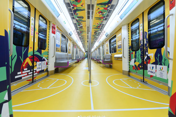 “大運(yùn)號”主題車以“在成都 成就每一個(gè)夢想”為主題的列車以紅、黃、藍(lán)、綠四種顏色為主基調(diào),車廂可以明顯看出大運(yùn)經(jīng)典U形符號輪廓,以蓉城“市樹”銀杏作為點(diǎn)綴,以抽象畫的形式表現(xiàn)大運(yùn)體操、跳水等運(yùn)動競技項(xiàng)目。