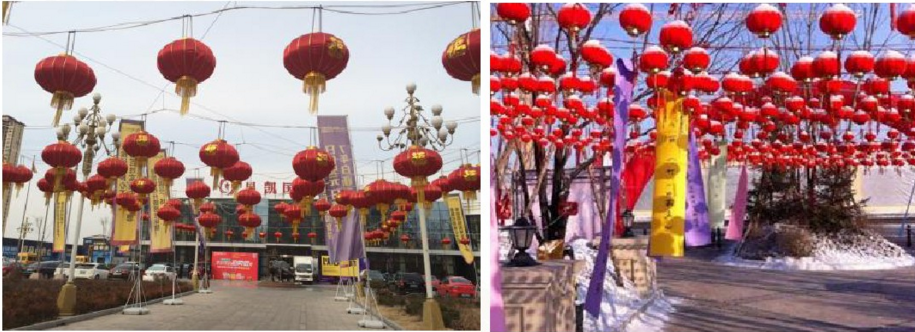 ? 售樓處門前小廣場,連成排掛滿紅色燈籠,要求密集成排懸掛。