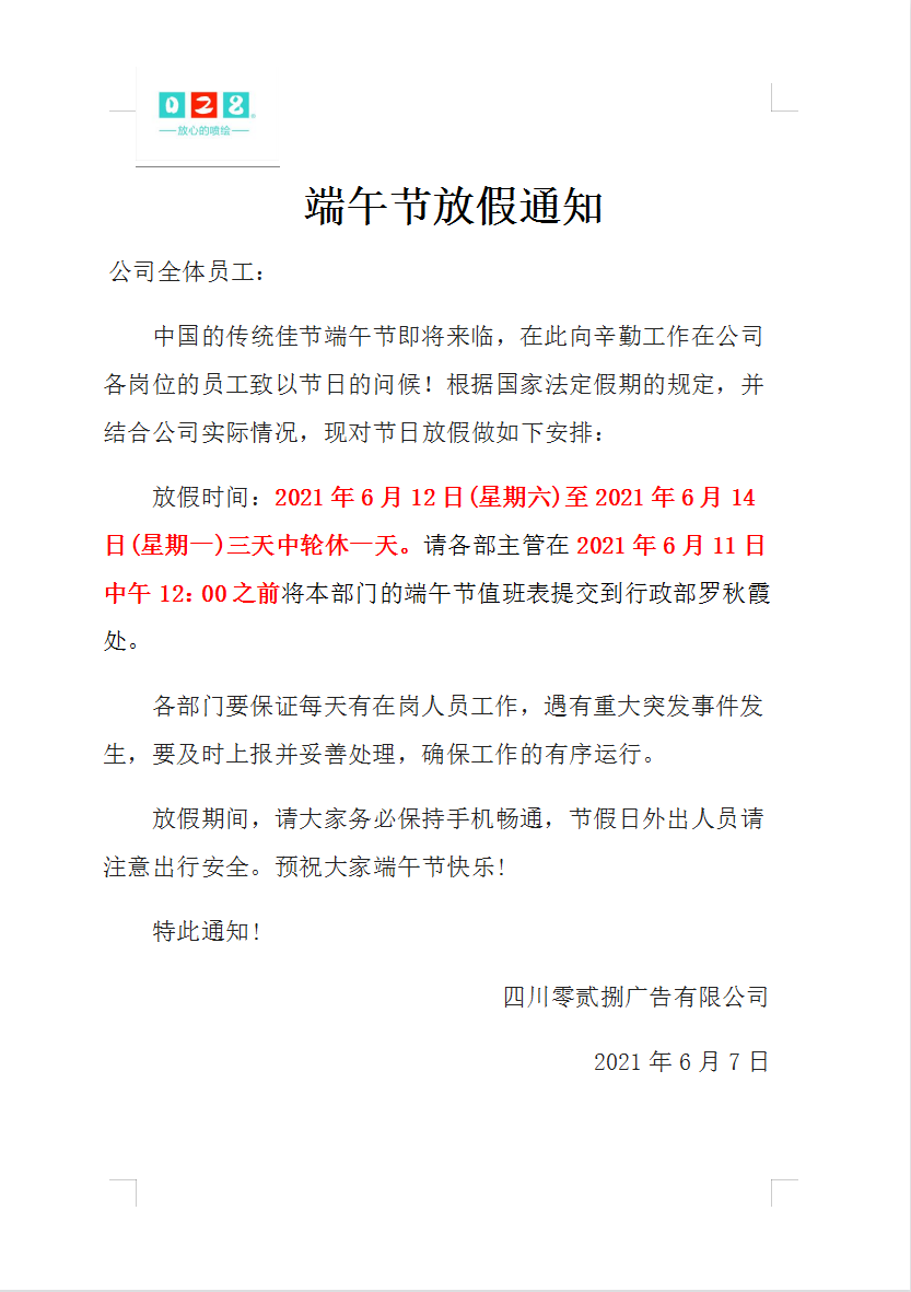 放假時(shí)間:2021年6月12日(星期六)至2021年6月14日(星期一)三天中輪休一天。請(qǐng)各部主管在2021年6月11日中午12:00之前將本部門的端午節(jié)值班表提交到行政部羅秋霞處。各部門要保證每天有在崗人員工作,遇有重大突發(fā)事件發(fā)生,要及時(shí)上報(bào)并妥善處理,確保工作的有序運(yùn)行。放假期間,請(qǐng)大家務(wù)必保持手機(jī)暢通,節(jié)假日外出人員請(qǐng)注意出行安全預(yù)祝大家端午節(jié)快樂!