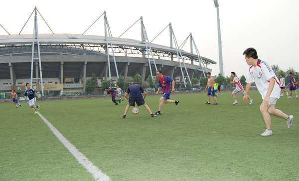 16:00過大家即到了現場,開始各自的熱身活動,有的在壓腿,有的在小跑,有的在練習射門和傳球。時間很快來到了17:00,兩支球隊來到球場中央,輪流握手表示友誼。隨著主裁判一聲令下,比賽正式開始!九天家私足球隊率先發球,他們把球傳給后衛,拉開距離,我方前鋒游正華迅速沖上前去搶球,對方見狀立即把球分到左邊,開始朝我右后方挺進,我右邊后衛羅乾君立即上前攔截,將球搶斷傳給中后衛,經過幾次傳球,球到了前衛童小家的腳下,他接球后傳給前鋒,游正華迅速插上,接球,過人,射門!這一連串動作帥呆了,球員和拉拉隊員們都在為之歡呼,心也提到了嗓子眼,就在這緊張的一刻,球被對方門將飛身抱住,沒打進。九天家私門將迅速將球發出,球很快過了中場,向我方攻來,我們的球員也跟著后撤,進行防守,對方的前鋒、前衛都迅速跟進,他們一個直傳球突入我方禁區,其前鋒快速插上,控球,打門!球進了!九天家私率先攻破了我方球門,大家都在歡呼、鼓掌,為之祝賀!