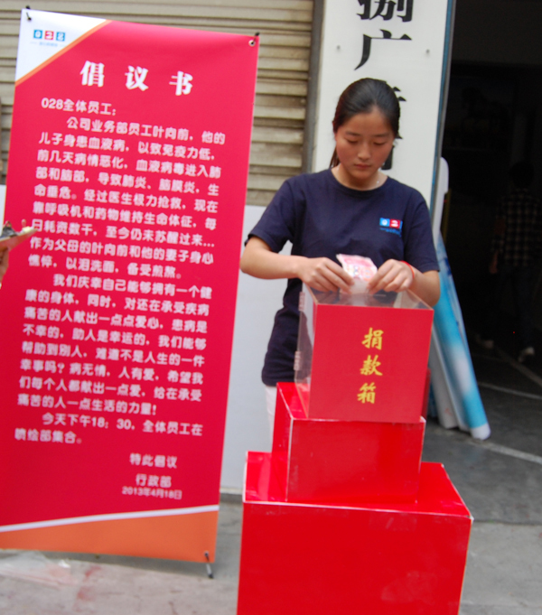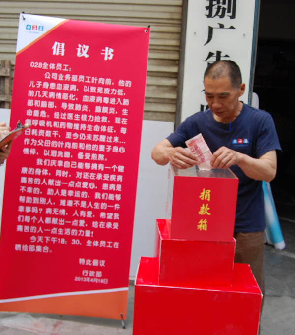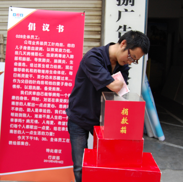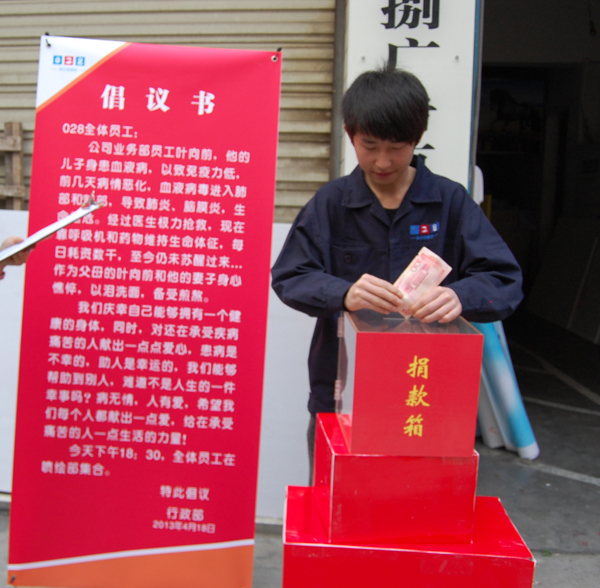 公司領導得知這一消息后,為他感到非常擔心,總經理汪平江親自前去看望,并送上慰問金。4月18日,028董事會倡議進行愛心捐款,下午18:30,全體028員工在公司門口集合,排隊依次進行捐款,一份份的真情,愛的力量在這一刻匯流成河……