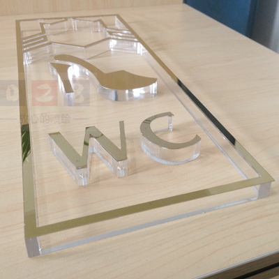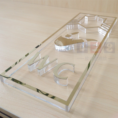 成都水晶標識牌雕刻加工 水晶標識牌是采用2公分厚的亞克力進行雕刻加工成型,在進行拋光打磨,最后在雕刻加工制作成型后的主體上粘貼上不銹鋼面板(不銹鋼面板也是采用雕刻加工制作而成的)。粘貼上面板之后體現出標識牌的輪廓,使得表述的更加清楚形象。