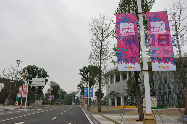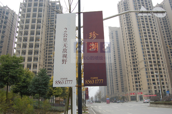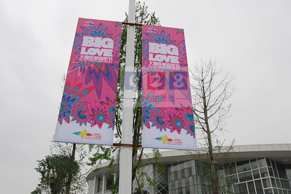 道旗一般采噴繪布、戶外寫真布噴繪,熱轉印旗幟布等。可以做單噴單看、單噴雙看和雙噴雙看等效果,噴繪布色彩鮮艷,畫面效果好,具有很好的防水性,不怕在雨水的沖刷下掉色。
