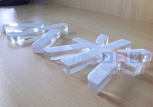 現在招牌字的制作工藝非常多,但大部分在制作企業形象墻字的時候都會選用水晶字來做招牌,也受到廣大企業的喜愛。水晶字是用化學藥水將透明亞克力跟有色亞克力粘合起來組合而成。成型時,可以將透明亞克力和有色亞克力分開來雕刻,也可先用化學藥水粘合后再一起雕刻(采用非金屬激光雕刻機)。因為不同材料各自的溶點不同,所以,是分開來雕刻還是粘合后再雕刻就得根據所用的材料來定,以便節約加工時間。水晶字由燈光照射看起來非常好看,它可以用在室內和室外,不怕日曬雨淋。是一種性價比較高的高檔字。可做形象墻字,也可做招牌字或其它裝飾字。但它不能做得太大,一般小于1米。水晶字的上色方式:
