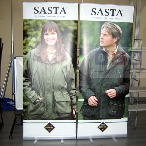 易拉寶因為一拉開就能成為一個海報架,因此而命名一拉寶。是街頭以及門店還有臨時攤位最佳的宣傳產品。易拉寶噴繪要告訴大家的是其實易拉寶的構造非常簡單,但是使用與攜帶方便。易拉寶一般是由一個座地的卷軸以及伸縮柱,頂扣,以及海報組成的一個卷軸。一般組成結構都是由塑膠以及鋁合金,而易拉寶的畫面一般是由pp合成紙,或者是帶背膠的相片紙以及寫真背膠,或者是背膠高光紙,或者是pp寫真紙。想要效果更好的一點就是相片紙。