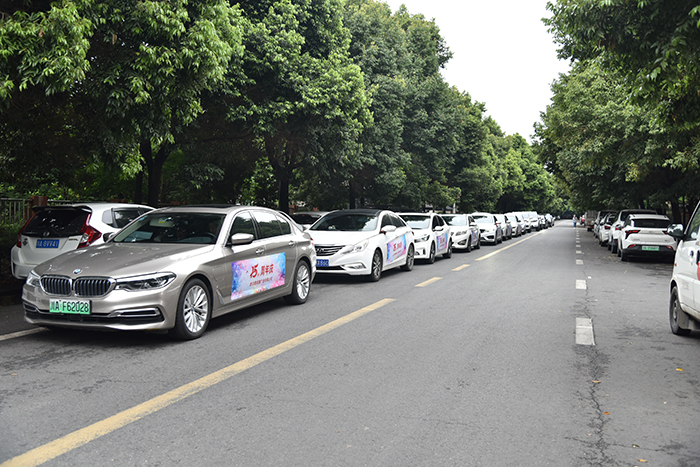 早上,貼著“四川零貳捌廣告有限公司十五周年慶”字樣的車輛整裝待發,一條龍的車輛遠遠看上去尤為的壯觀,周年慶典也在這里拉開了序幕。