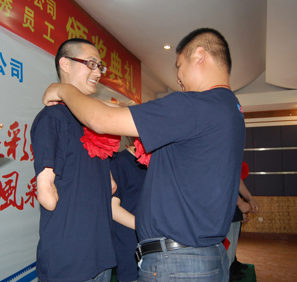 公司總經理親自為優(yōu)秀員工帶上大紅花以表示感謝,他為公司付出青春和汗水。