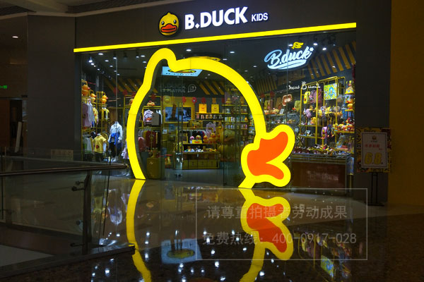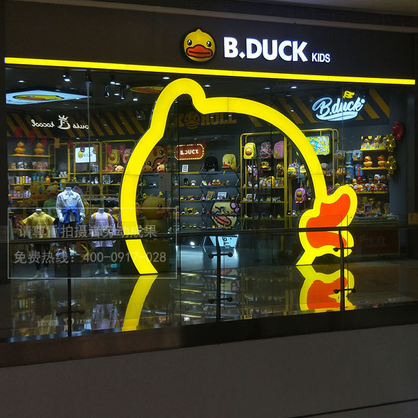 B.Duck kids小黃鴨因為產(chǎn)品超可愛所以受到廣大客戶的喜愛,所以在很多的商場都會有兒童潮牌實體店的入駐,其門店裝飾、店面招牌設(shè)計門頭發(fā)光字制作方面都特別的新穎。