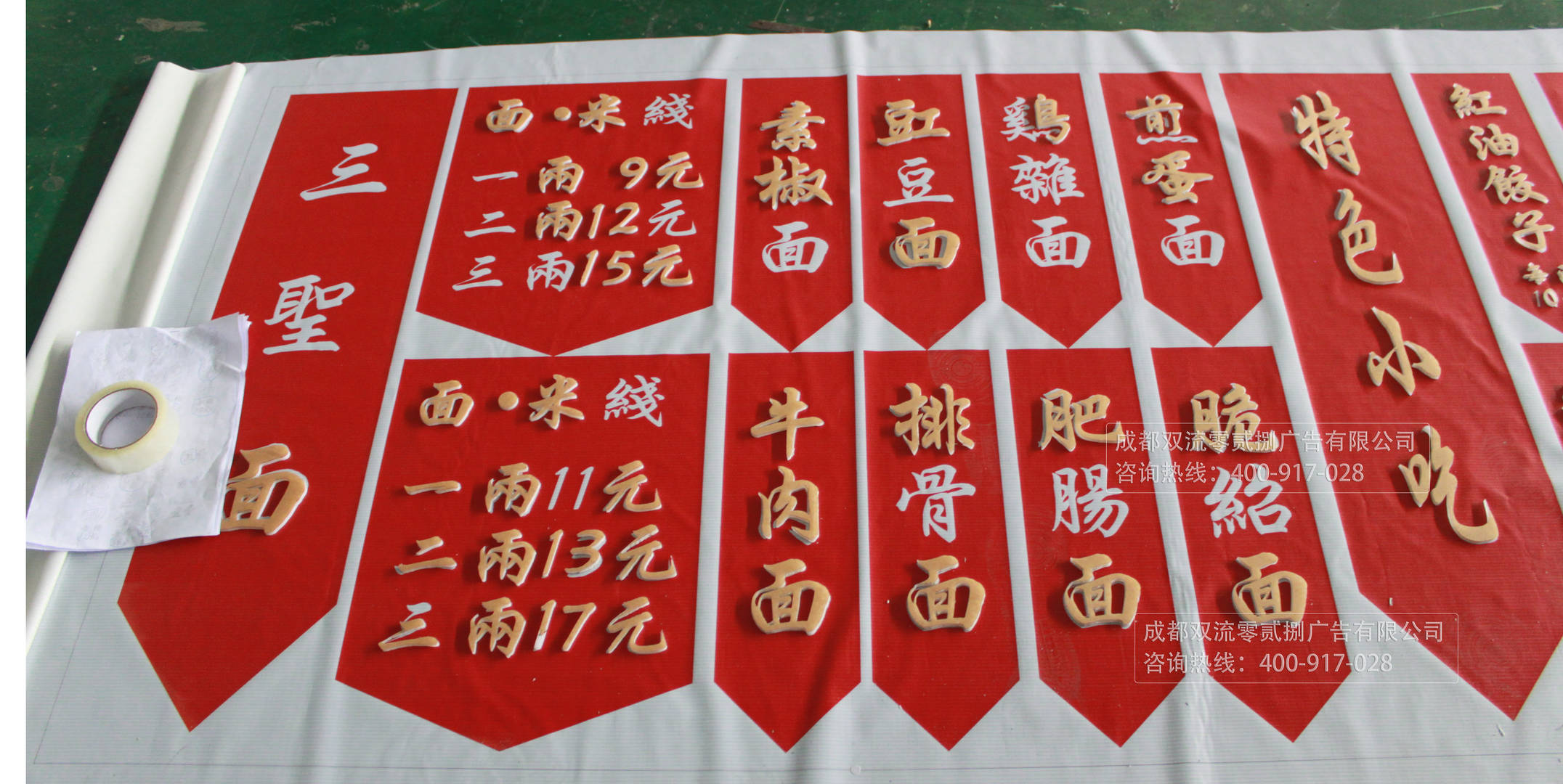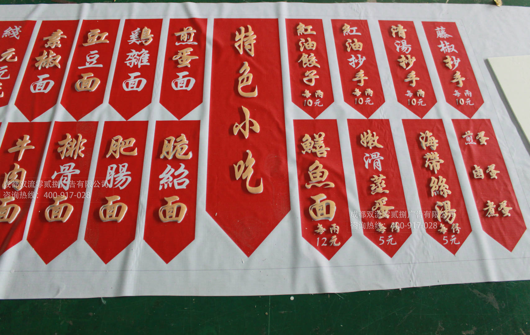 底部是運用了厚實的噴繪布能夠讓裝飾品更有質感,紅色部分采用了成都零貳捌廣告公司的UV噴繪,并且字體是運一種設計師廣泛運用的亞克力的材質,人工雕刻打磨而成,整個裝飾顯得質感和設計感十足。