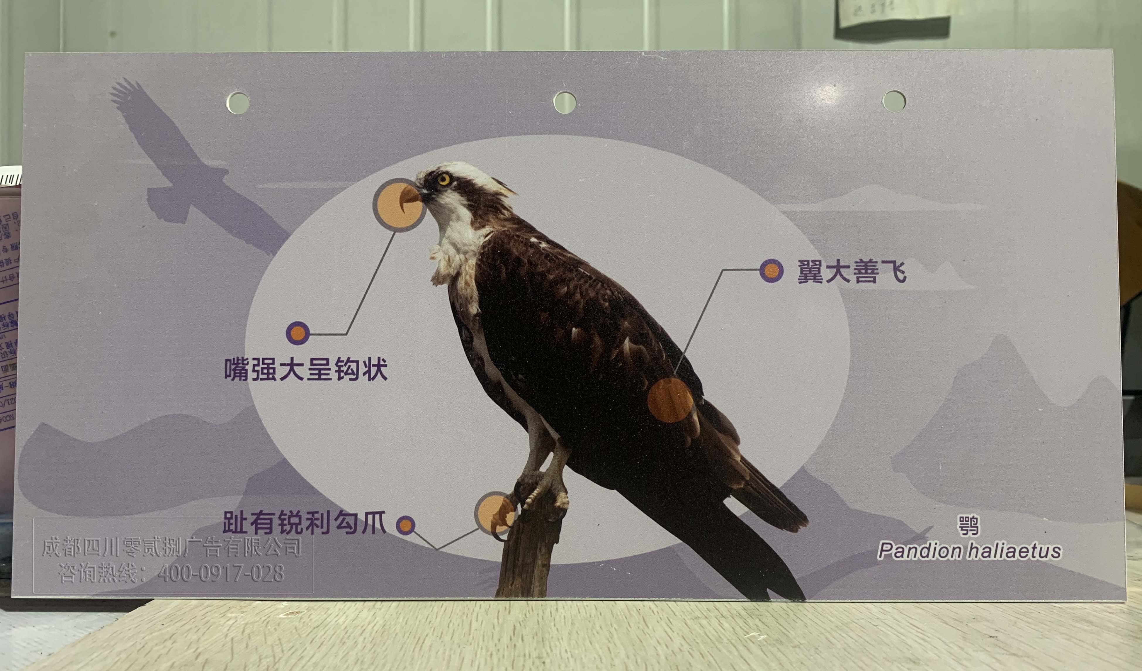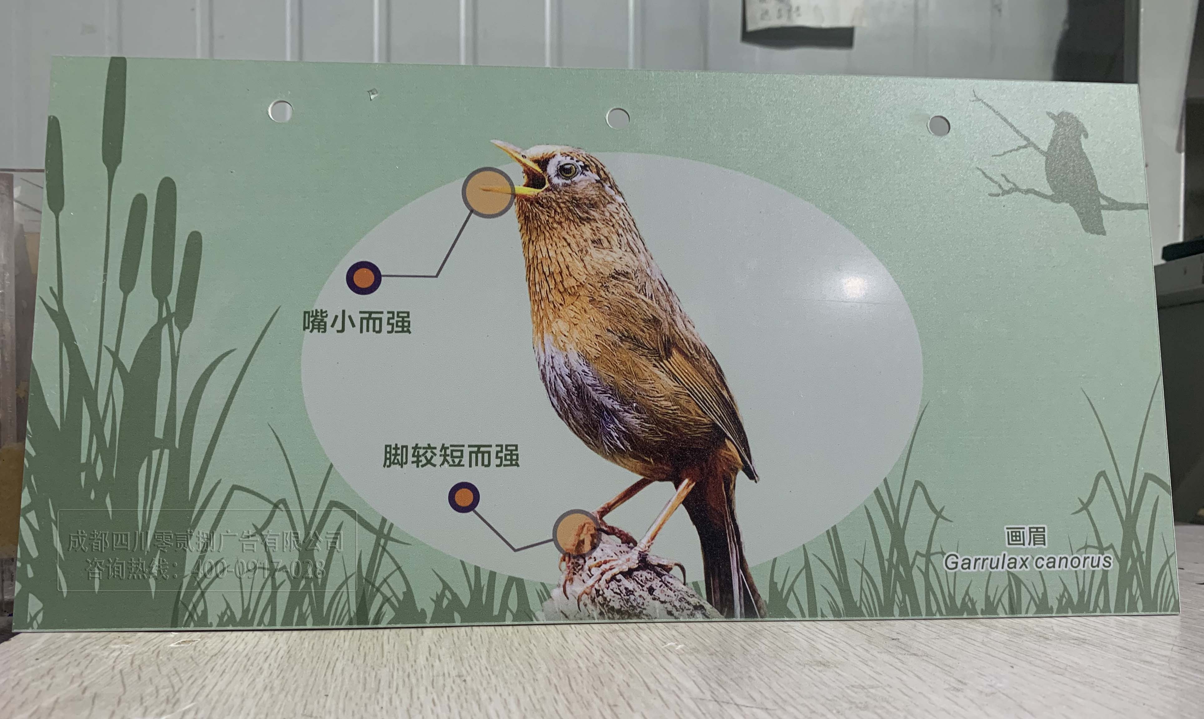 圖片為028廣告公司加工而成,由圖可見介紹鳥兒的知識,雙色板色彩更立體,活靈活現,適合展覽等場合平面雙色板展示。打孔適合固定不影響整體效果。