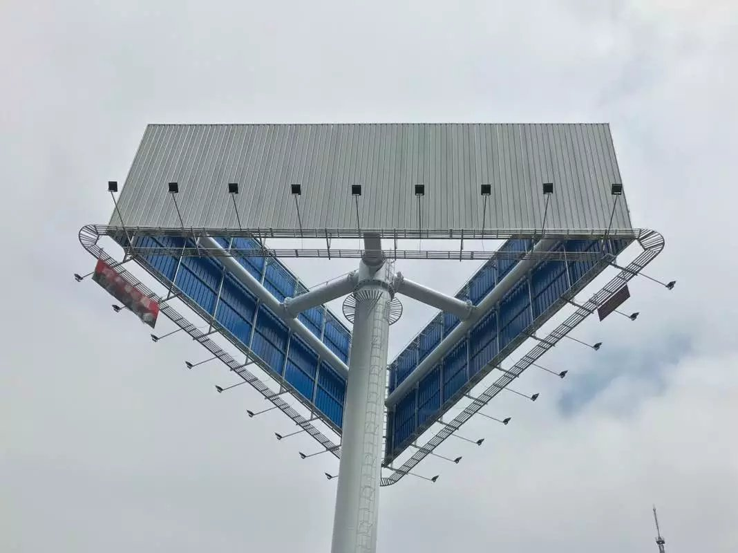 單立柱廣告牌的上部結構主要由牌面與立柱組成。其中的牌面結構一般由型鋼焊接而成的鋼架與表面鐵皮組成,其作用是作為廣告發布的載體。其設計要求滿足結構強度、防雷、防腐等要求。