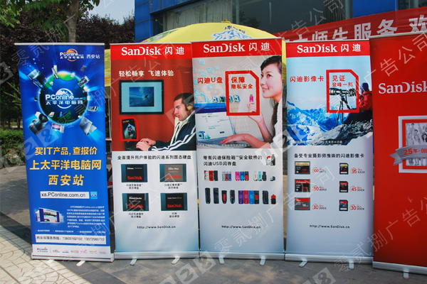 易拉寶規格尺寸的認識 易拉寶或稱海報架、展示架,廣告行業內也叫易拉架、易拉得、易拉卷等,是樹立式宣傳海報。常見于人流多的街頭通道,協助個體戶式的路演推銷活動,或是臨時攤位。易拉寶主要質料是塑膠或鋁合金。和易拉寶用法相似的宣傳產品是刀旗、海報、X展架等。