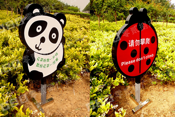 花草牌一般造型多樣,美觀可愛,有動物造型,有花草造型,還有各種設(shè)計元素造型等。色彩多數(shù)也比較艷麗,為了能在花草叢中凸顯出來,顏色多為暖色為主。或根據(jù)該單位來的標(biāo)準(zhǔn)色來決定色彩。
