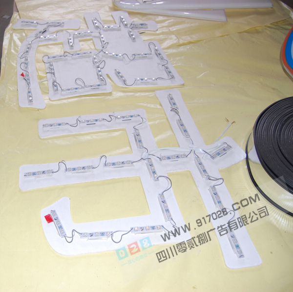 內(nèi)嵌LED發(fā)光模塊:已完成LED發(fā)光模塊安裝的吸塑字內(nèi)部圖片。LED模塊采用國(guó)內(nèi)知名品牌的食人魚(yú)LED發(fā)光模塊,具有亮度高、壽命長(zhǎng)、光衰小、能耗低的特點(diǎn)。供電線路經(jīng)專(zhuān)業(yè)技術(shù)人員設(shè)計(jì),具有回接線路,能夠有效避免短路等情況的發(fā)生。