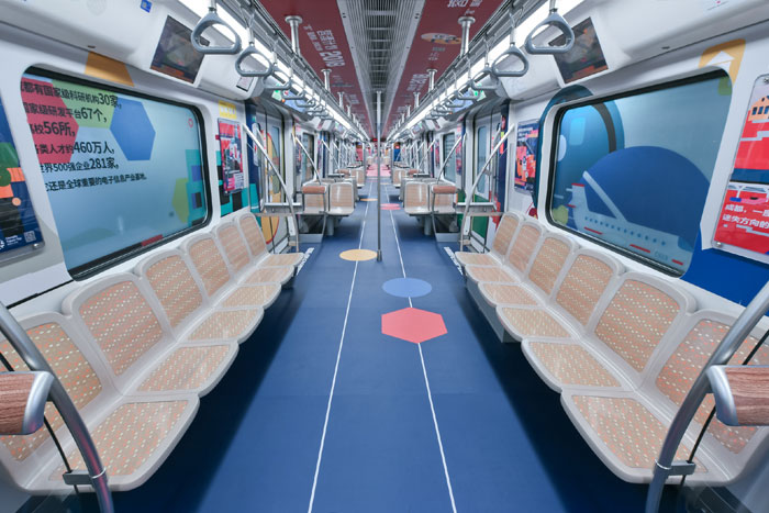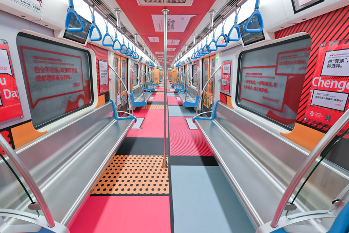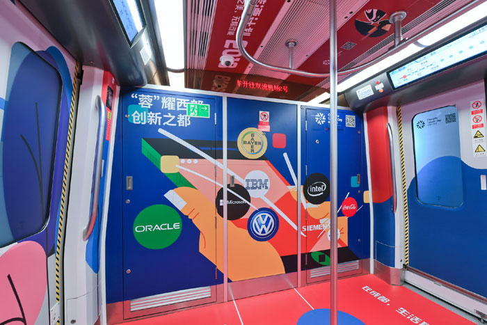 在視覺風(fēng)格上,據(jù)主題列車設(shè)計單位——東道品牌創(chuàng)意集團介紹,地鐵10號線作為向中外游客展示成都形象的一扇窗口,主題列車“創(chuàng)新之都,‘蓉’我圓夢”采用“‘蓉’耀西部,創(chuàng)新之都”“‘蓉’合之美,無限可能”兩大主題,力圖凸顯成都獨特的城市魅力,車廂設(shè)計以簡約、國際化的插畫形式,采用紅色和藍(lán)色兩種主色調(diào)。