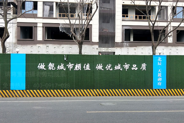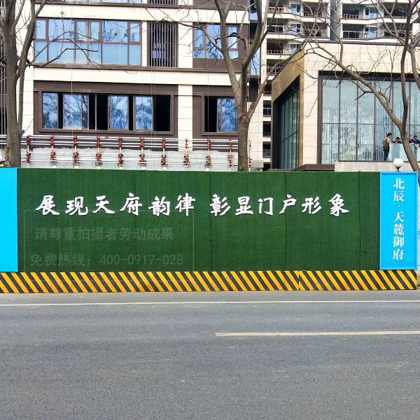 房地產項目圍墻圍擋廣告制作多是采用假草坪綠植來進行制作,這種用植被組成的工地圍擋也稱為綠籬式圍擋,是以墻體立體綠化的方式,對工地進行美化、綠化、亮化處理,彌補了施工圍擋占用公共綠地的遺憾。