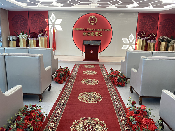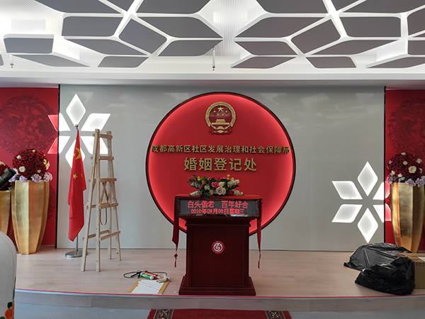 圖是四川零貳捌廣告公司設(shè)計(jì)制作的高新政務(wù)中心的婚姻登記處的文化墻