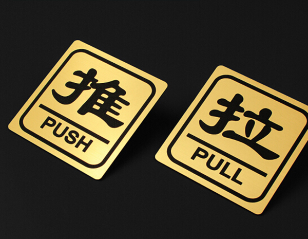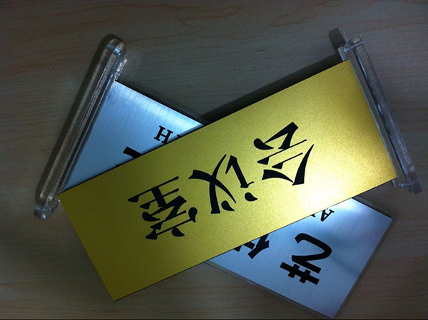 雙色板雕刻字:是使用叫雙色板作為原材料雕刻而成的。所謂的雙色板是通過一定的化學工藝然后生產出來的一種帶有柔性用來裝飾的,然后將第一層用機器雕刻掉,然后雙色板第二層就好露出顏色。